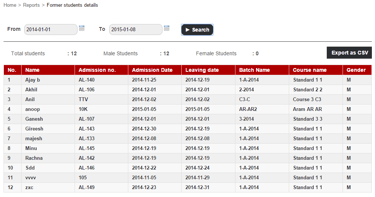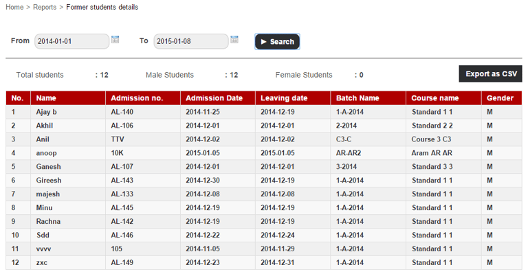 The report lists all the students who were archived during the specified date range. The report includes each student’s admission date, leaving date, batch, course, and gender.