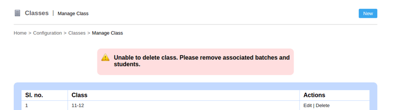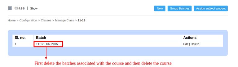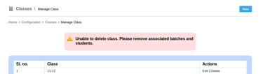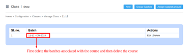I am not able to delete a course.While deleting it shows a message-'Unable to Delete class/course. Please remove existing batches and students'