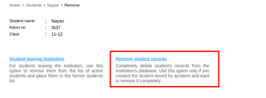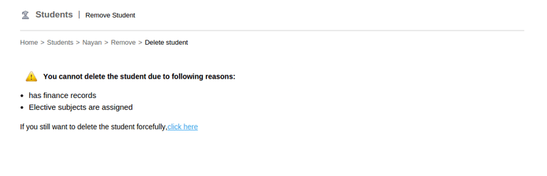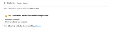 Even when deleting students in your Fedena instance, if there exist any dependencies such as elective subjects assigned to the student, finance records associated with the student etc. then a message will pop up, notifying the user about the dependencies that exist.