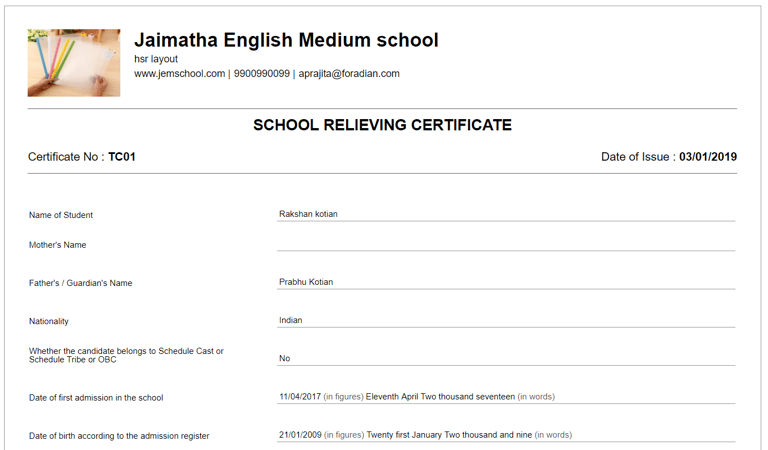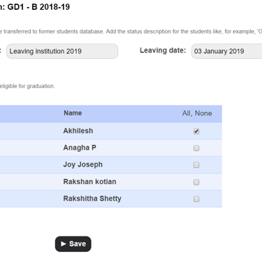 There are also options to uncheck the students who are not eligible for graduation, status field to enter the comment, Leaving date field is provided to mark the leaving date of the students and an option to generate TC.