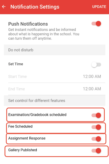 The notification management option is also available in the mobile app where the user can personalize the notification to be received/shown to the mobile app notification bar.