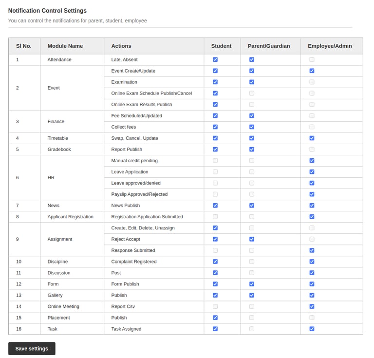 The notification control setting provides the entire control over the internal notification in the Fedena application. The admin/privileged employee can control the notification sent from different modules to Student, Parent/Guardian, Employee/Admin. By default, all the notification options will be enabled which can be configured as per the requirement.