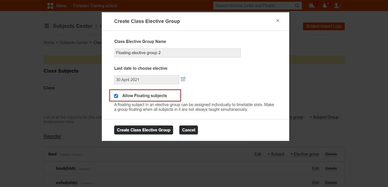 A new type of elective group has been introduced in the subject center, Floating Elective Group. It is a flexible version of the existing elective group. To achieve this, an admin or a privileged user can enable the 'Allow floating subjects' in the 'Create Class Elective Group' while creating an elective group.