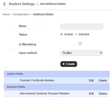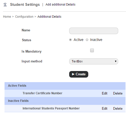 If an additional field is active it will be displayed in the admission form, and if we do not want a custom admission detail field to be displayed in the student admission form, we can inactivate it or delete it. However, we cannot delete a custom admission detail field that has already been used to record student details.