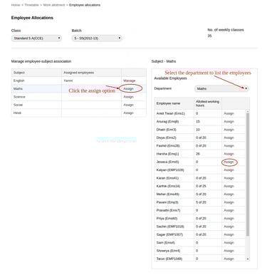 You can see the allotted working hours of each employee and associates subjects accordingly.