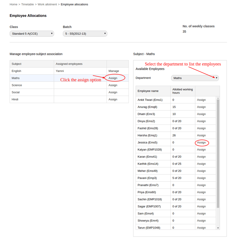 2. Once you click the option Employee allocation , it will list all the subject that have been created under that particular batch. Click the Assign option against the subject.